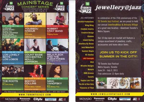 LAG concepts was featured in the Jewellery@Jazz in the Jazz Festival 2011, located at Metro Square at the heart of downtown Toronto’s entertainment district. We had a booth display there along with many indoor and outdoor concerts. I personally was able to meet with Nikki Yanofski (the girl who sang the theme song for the 2010 Winter Olympics in Vancouver “I Believe” she was one of many performers there.