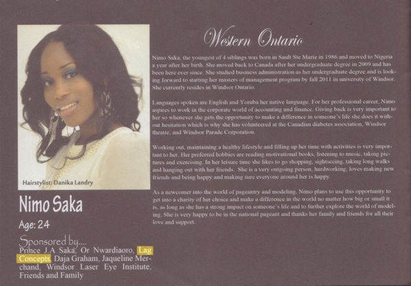 LAG concepts sponsored Nimo Saka for Western Ontario for the Miss Canada Globe 2011. She also won 4th runner up for the pageant …Good Job!!!